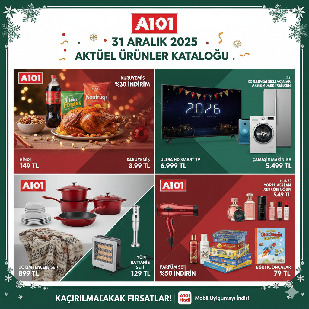Anasayfa • A101 Aktüel • A101 31 Aralık 2025 Aktüel Ürünler Kataloğu A101 Aktüel A101 31 Aralık 2025 Aktüel Ürünler Kataloğu admin - Aralık 29, 2025 108 0 31 Aralık 2025 Çarşamba günü, Türkiye’nin en yaygın perakende zincirlerinden biri olan A101, hem yılın son gününe hem de yeni yılın ilk sabahına hazırlık yapan müşterileri için oldukça kapsamlı bir Aktüel Ürünler Kataloğu ile karşımıza çıkıyor. Bu hafta yayınlanan katalog, sadece mutfak ihtiyaçlarını değil, teknoloji meraklılarını ve evini yenilemek isteyenleri de memnun edecek bir çeşitlilik sunuyor. Yılbaşı Sofralarına Özel Lezzetler Kataloğun ilk sayfalarında, yılbaşı gecesinin vazgeçilmezi olan atıştırmalıklar ve içecekler dikkat çekiyor. Kuruyemiş çeşitlerinde yapılan büyük indirimler, cips paketleri ve çeşitli meşrubatlar, ekonomik bir kutlama planlayanlar için ideal seçenekler sunuyor. Ayrıca, akşam yemeği için dondurulmuş hindi, özel soslu tavuk ürünleri ve kaliteli peynir tabakları da “Aldın Aldın” etiketiyle raflardaki yerini alıyor. Teknoloji ve Beyaz Eşyada Büyük Fırsatlar A101’in 31 Aralık kataloğunda teknoloji severler unutulmamış. Özellikle akıllı televizyonlar ve akıllı telefonlar, piyasa değerinin altında fiyatlarla satışa sunuluyor. Ultra HD Smart TV’ler: Büyük ekran deneyimini evine taşımak isteyenler için farklı marka ve boyut seçenekleri mevcut. Beyaz Eşya: No-Frost buzdolapları, 9 kg yıkama kapasiteli çamaşır makineleri ve enerji tasarruflu bulaşık makineleri, ücretsiz teslimat ve kurulum avantajıyla öne çıkıyor. Ev Yaşam ve Mutfak Gereçleri Yeni yıla girerken mutfağını yenilemek isteyenler için döküm tencereler, şık yemek takımları ve pratik el blender setleri geniş yer tutuyor. Ayrıca, soğuk kış günlerinde evinizi ısıtacak elektrikli ısıtıcılar ve yün battaniyeler de uygun fiyatlı alternatifler arasında. Çocuklar için ise eğitici oyuncaklar, kutu oyunları ve hikaye kitapları, harika birer yılbaşı hediyesi seçeneği olarak sunuluyor. Kişisel Bakım ve Kozmetik Yılbaşı gecesi şıklığını tamamlamak isteyenler için saç şekillendiriciler, epilasyon cihazları ve ünlü markaların parfüm setleri bu hafta reyonlarda olacak. Cilt bakım kremleri ve makyaj ürünlerinde uygulanan %50’ye varan indirimler, kişisel bakımına önem verenlerin yüzünü güldürecek cinsten. Sonuç olarak; A101 31 Aralık 2025 kataloğu, temel gıdadan lüks tüketime kadar her bütçeye hitap eden dengeli bir liste sunuyor. Stoklarla sınırlı olan bu ürünleri kaçırmamak için erken saatlerde mağazalara uğramak veya A101 Hadi uygulamasını kullanmak avantajlı olabilir. Etiketler31 aralık a101 Yazı gezinmesi « Önceki Yazı Bir yanıt yazınYanıtı iptal etE-posta adresiniz yayınlanmayacak. Gerekli alanlar * ile işaretlenmişlerdir Bir dahaki sefere yorum yaptığımda kullanılmak üzere adımı, e-posta adresimi ve web site adresimi bu tarayıcıya kaydet.
